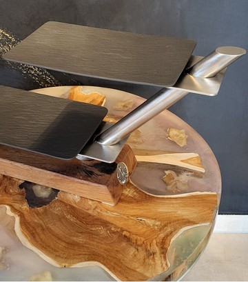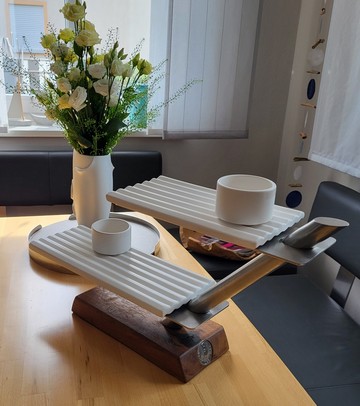 Design-Etagere aus Holz & Edelstahl – handgefertigtes Statementstück. Diese außergewöhnliche Etagere verbindet modernes Design mit traditioneller Handwerkskunst. Klare Linien aus gebürstetem Edelstahl treffen auf einen massiven Holzsockel – ein spannender Kontrast, der jede Tafel aufwertet und sofort ins Auge fällt. Die schwebend wirkenden Ebenen bieten stilvollen Platz für Canapés, Pralinen, Käse, Antipasti oder feines Gebäck. Ob beim festlichen Empfang, im gehobenen Gastronomiebereich oder als exklusives Wohnaccessoire: Diese Etagere setzt Ihre Speisen gekonnt in Szene. Porzellanteller in schwarz oder weiß erhältlich. ✨ Besonderheiten auf einen Blick: - Handgefertigt mit Liebe zum Detail - Edle Kombination aus Massivholz, Porzellan und Edelstahl - Modernes, zeitloses Design - Stabiler Stand und hochwertige Verarbeitung - Ideal für Feiern, Events, Gastronomie oder besondere Anlässe - Diese Etagere ist mehr als ein Servierstück – sie ist ein Designobjekt, das Genuss und Ästhetik vereint. Für Menschen, die Wert auf Qualität, Individualität und Stil legen.