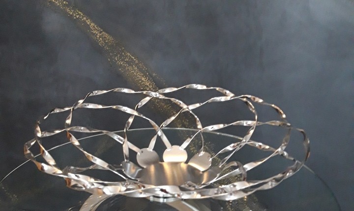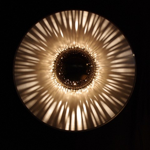 Magie in Licht und Schatten. Einzigartiges Leuchtobjekt aus tiefgezogener, mit Spezialschliff versehender Aluminiumscheibe ca.1,0m oder 1,4m Durchmesser. Die Halb-Kugeln ( aus Keramik) sind in verschiedenen Glasuren (gold, antrazit, weiss, goldbronze) erhältlich.