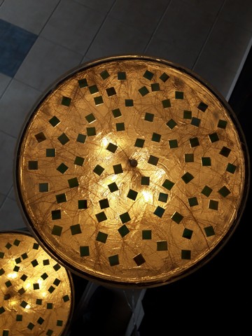 Der Durchmesser der Lampe beträgt 100cm*90cm. Die innere Scheibe ist mit 800ter bzw. 900ter Blattgoldauflage versehen.