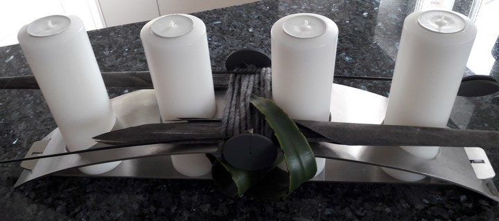 Edelstahlkerzenständer mit Teelichthaltern in Kerzenform.