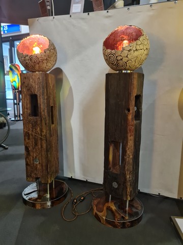 Stehlampen in verschiedensten Ausführungen. Die Höhe der Lampen beträgt zwischen 1,3 und 1,8 m, es sind Keramikkugeln in unterschiedlichen Ausprägungen verbaut, mit Edelstahl und Eichenholzbalken.