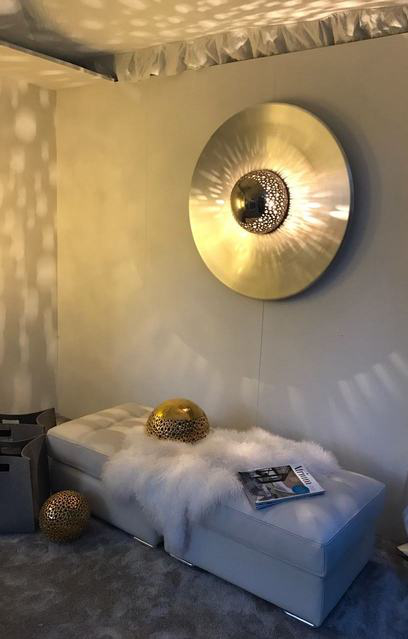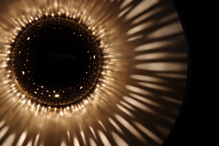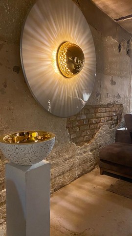 Magie in Licht und Schatten. Einzigartiges Leuchtobjekt aus tiefgezogener, mit Spezialschliff versehender Aluminiumscheibe ca.1,0m oder 1,4m Durchmesser. Die Halb-Kugeln ( aus Keramik) sind in verschiedenen Glasuren (gold, antrazit, weiss, goldbronze) erhältlich.