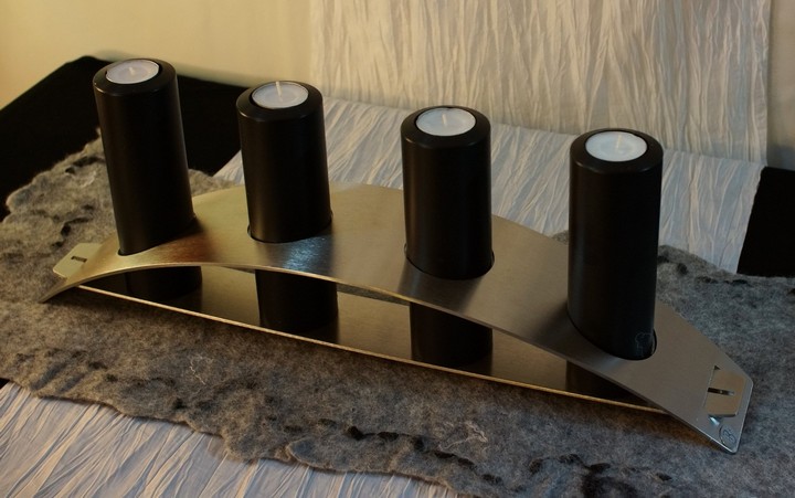 Edelstahlkerzenständer mit Teelichthaltern in Kerzenform.